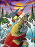 A bright and colorful work of art representing an exciting fishing excursion featuring the mighty King Salmon. A vibrant puzzle showcasing the thrill of fishing during the summer season, amidst stunning mountain landscapes and under the glow of the midnight sun with scenic details that highlight the beauty of this Alaskan Adventure.